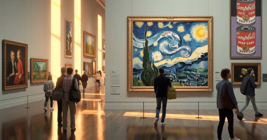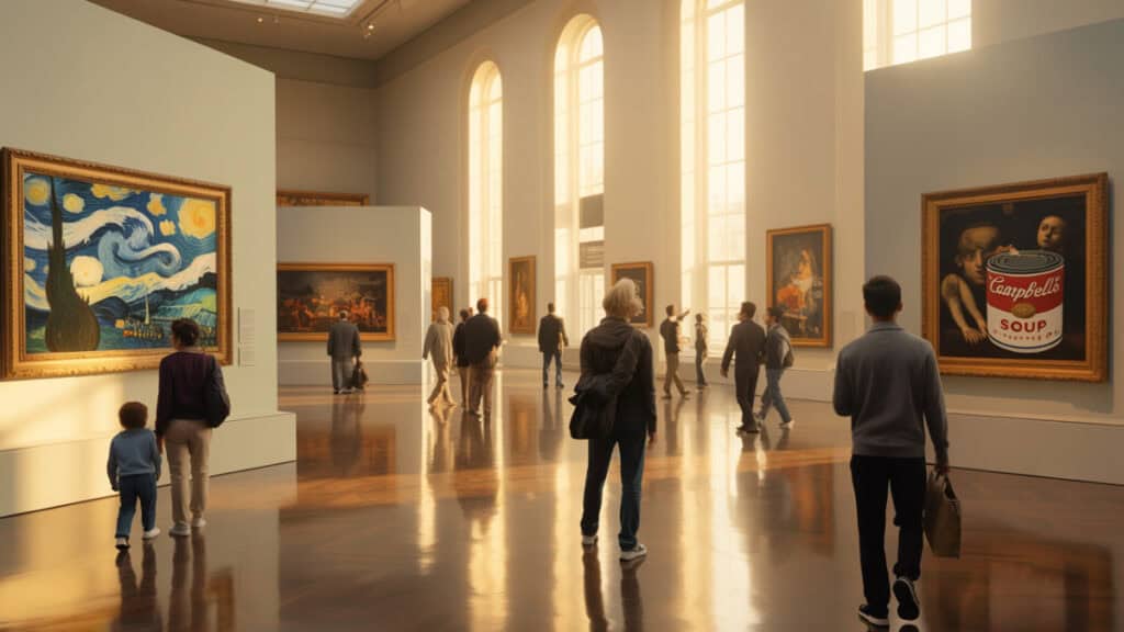 Musea zoals Louvre, Rijksmuseum, Van Gogh Museum, MoMA en Prado tonen iconische schilderijen, vaak met uitleg, rondleidingen en educatieve programma’s.